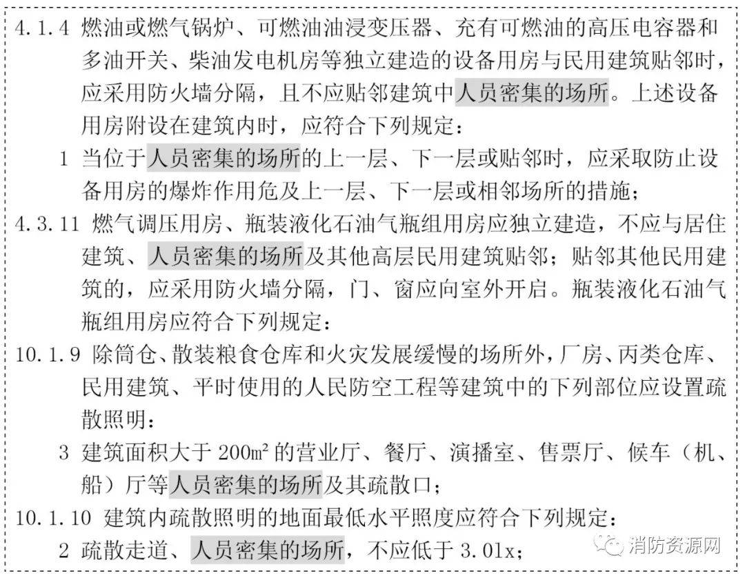 三、有关“人员密集的场所”的条文,比如,第4.1.4条、第4.3.11条、第10.1.9条、第10.1.10条第2款等,与“破局人员密集场所·人员密集的场所”专题中的“人员密集的场所”一致。